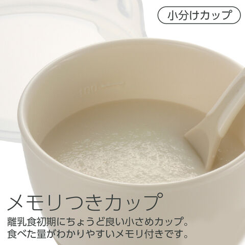離乳食初期にちょうど良い小さめカップ、食べた量がわかりやすいメモリ付きです。