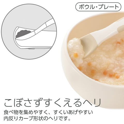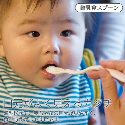 スプーンは波型形状で、赤ちゃんの口元が見やすく、食べ与えがしやすいです。
