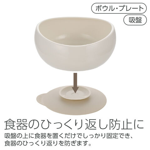 吸盤の上に食器を置くだけでテーブルにしっかり固定でき、食器のひっくり返りを防ぎます。