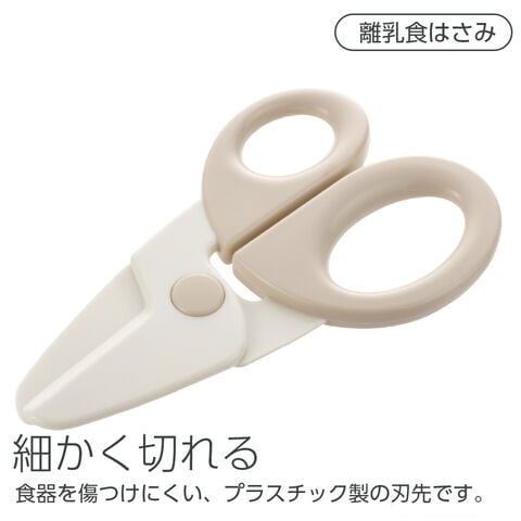 離乳食はさみは細かく切れて、食器を傷つけにくい、プラスチック製の刃先です。
