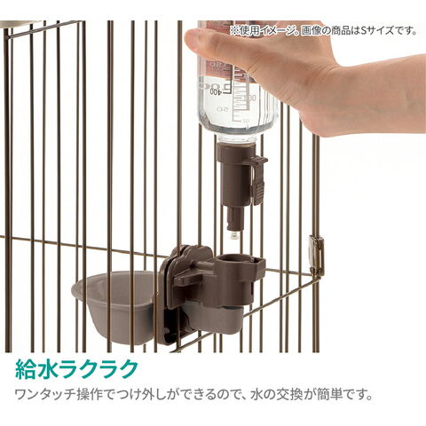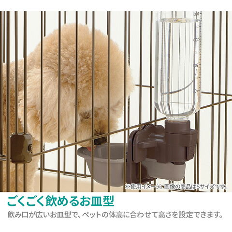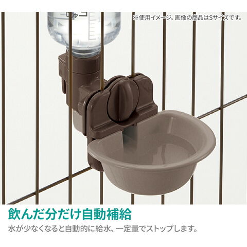 ケージ・サークルに取り付けて使用する、ボトル付きのお皿型の給水器【犬用/Mサイズ】。