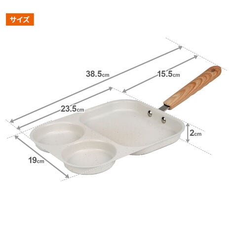 円形仕切り2つと、長方形の仕切り1つがついたフライパン。忙しい朝に、朝食やお弁当のおかずが一度に作れます。