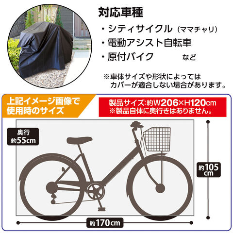 ママチャリから原付バイクまで一般的なシティサイクル自転車から電動アシスト付きの自転車、原付バイクまでを覆えるサイズ。