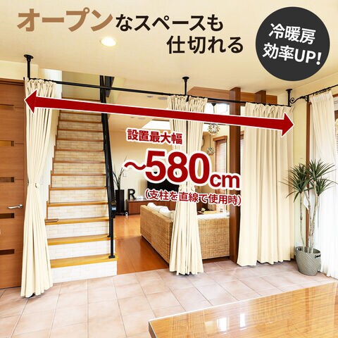 支柱3本とカーテンポール2本の組み合わせで、最大幅580cmまで対応。L字にも、直線にも仕切れます。