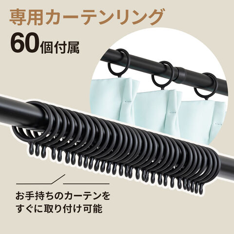 専用カーテンリング60個付き。市販のカーテンフックでカーテンを取り付けることができます。※カーテンは付属しておりません。