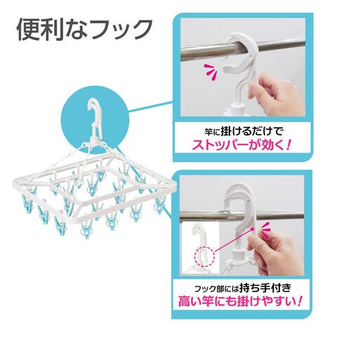 ズレにくい、掛けやすい竿にフックをはさんで入れるとストッパーが効き、風などでズレにくい仕様です。