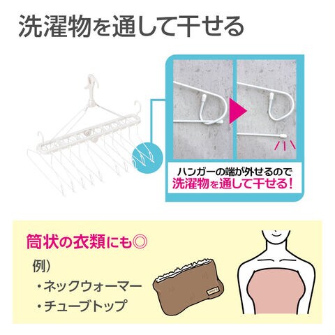 筒状のものもOKなハンガーハンガーの端が外せるので洗濯物を通して干すことができます。