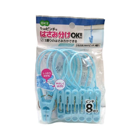 洗濯ばさみ ひも付き2WAYピンチ 8個入 ブルー | 洗濯バサミ のみ 青 洗濯ピンチ 紐つき しっかり やさしく 2通りではさめる ジーンズ 下着 ハンカチ 跡が付きにくい