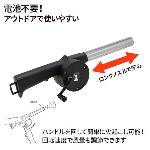ハンドルを回すだけで強力な風を送り込めるBBQ用火起こし器。