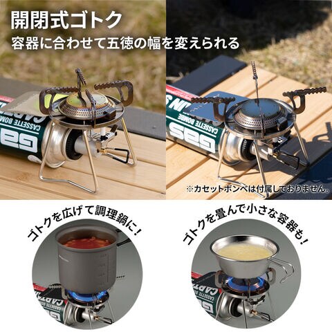 開閉式ゴトクシェラカップなどの小型容器から、クッカーまで乗せられる可変式タイプ。