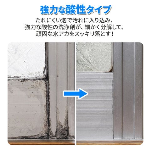 強力な酸性タイプたれにくい泡タイプで汚れに入り込み、強力な酸性の洗浄剤が細かく汚れを分解して、スッキリ落とします。