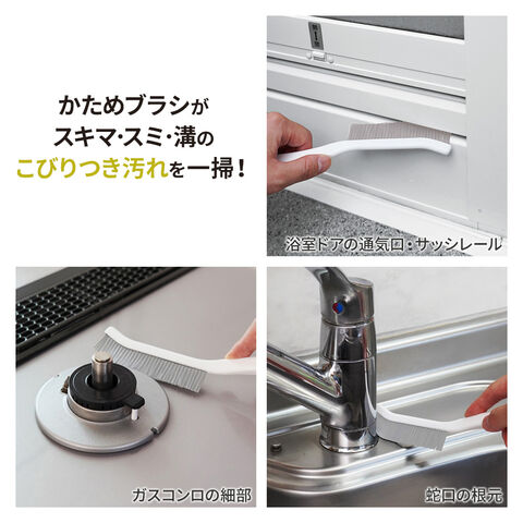 かためブラシコシのある硬めのブラシが、水アカ・カビ・油汚れなどのこびりついた汚れをかき出します。