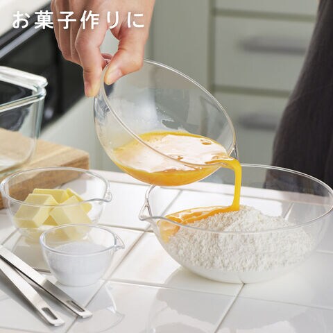 注ぎ口つき便利な注ぎ口つきなので、ドレッシングづくりやお菓子づくり、下ごしらえと便利に使えます。