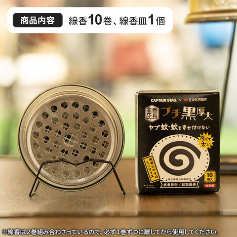 屋外 虫よけ 鹿番長印ノ蚊取線香 プチ黒厚太 線香皿セット 10巻入 UM-1648 | 携帯用 蚊取り線香 ホルダー付 吊下げ式 ヤブ蚊 殺虫 忌避 蚊帳 日本製 太巻 厚太 10個入り ミニサイズ アウトドア 虫除け 住友化学園芸 コラボ
