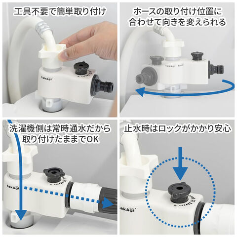 取り付け簡単洗濯機の給水ホースを回して締めこむだけなので、工具不要で簡単に取り付けられます。