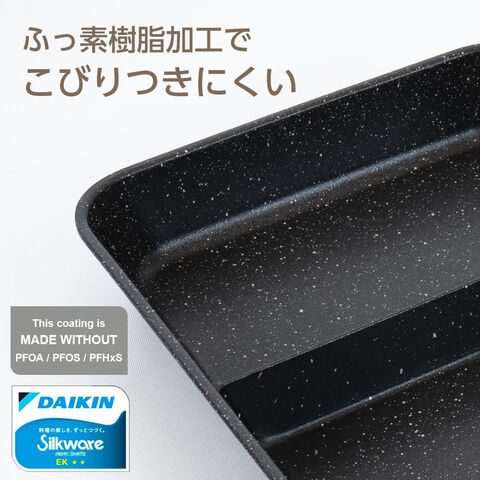 内面はダイキン工業製の「シルクウェアEK 」ふっ素樹脂加工を施し、こびりつきにくく少量の油でヘルシー調理が可能。