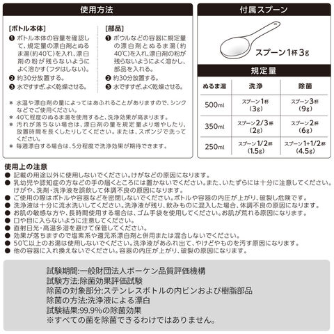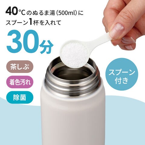 茶しぶ・着色汚れをすっきり除去気になる茶しぶや飲み物による着色汚れに。酸素系漂白剤の力で、ボトルを清潔な状態に整えます。除菌にも使えます。※すべての菌を除菌できるわけではありません。