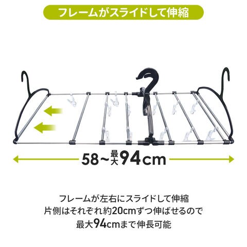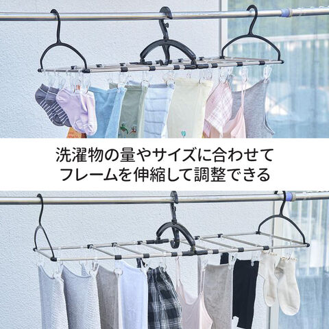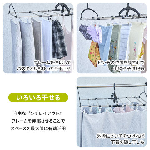 フレームが伸縮して、洗濯物の量に合わせてサイズを調整できるピンチハンガー。