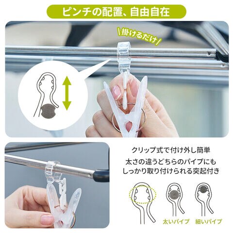 ピンチレイアウトが自由自在洗濯物の量やサイズに合わせて、フレームにピンチを自由に取り付け・移動できます。
