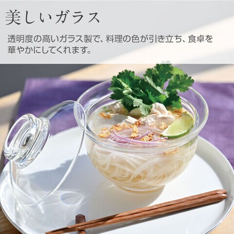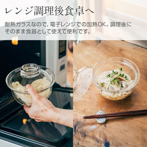 レンジ調理から食器としての利用までできる、フタまで耐熱ガラス製のどんぶり鉢。