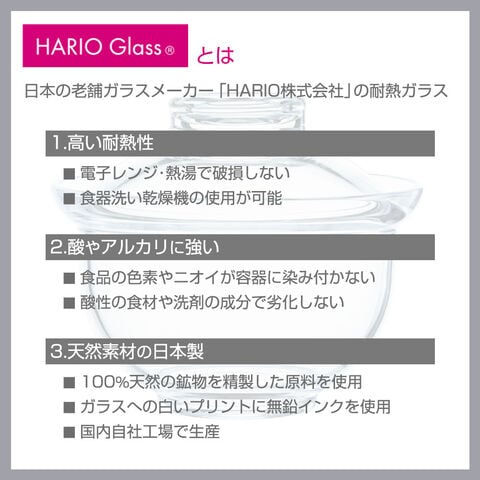 国産耐熱ガラス「HARIO Glass」製日本の製造工場で作られた国産の耐熱ガラス「HARIO Glass」を使用しています。