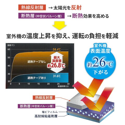 遮熱+断熱で室外機の温度上昇を抑制トップの熱線反射層が太陽光(日射)を反射し、中空状バルーン層の断熱効果でエアコン室外機の温度上昇を抑えます。