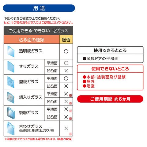 すりガラス・型板ガラスの凹凸面、網入りガラス・複層ガラス、合わせガラス、木部・塗装面及び壁紙、屋外、浴室