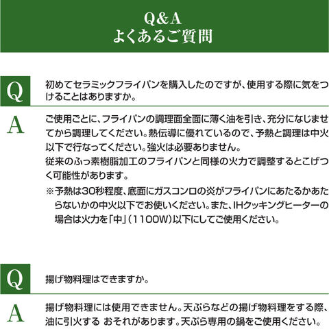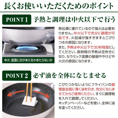 長くお使いいただくためのポイント予熱と調理は中火以下で。予熱は30秒程度にしてください。