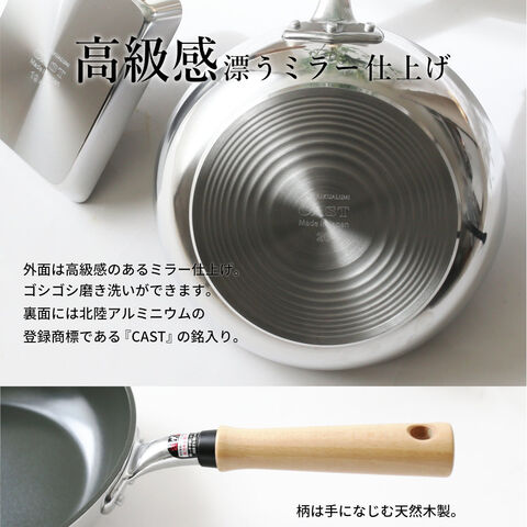 材質:内面/セラミック塗膜加工 外面/ミラー仕上げ 底面/サテン仕上げ 取っ手/天然木