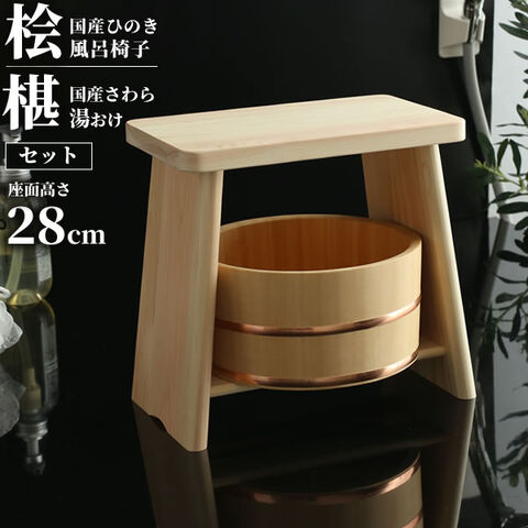 風呂椅子 【2点セット】ひのきの風呂椅子 + さわらの湯おけ 座面高28cm | 桧 ヒノキ 木製 天然 風呂イス いす バスチェア 日本製 バススツール 浴室 用品 風呂 和風 旅館