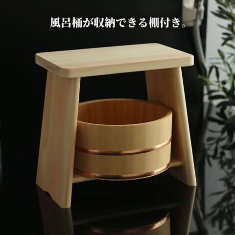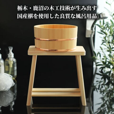 国産桧とさわらを使用した木製フロ椅子と湯桶の2点セット。