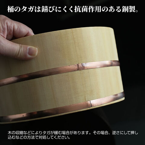 木の収縮などにより、タガが緩む場合があります。その場合、逆さにして押し込むなどの方法で対処してください。