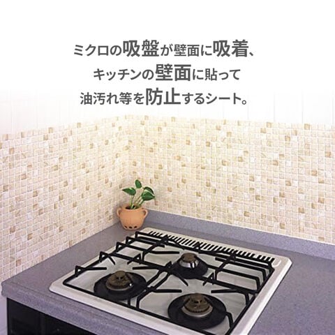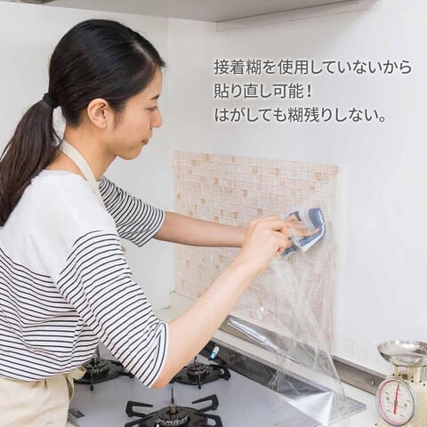 キッチンの壁面に貼って、油汚れ等を防ぐ吸着シート。貼り直し可能でキレイに貼れる。