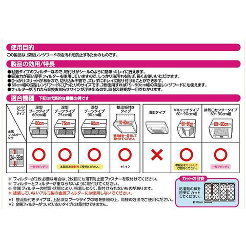 60cm幅の深型レンジフードにぴったりのサイズです。2枚使用すれば75~90cm幅の深型レンジフードにも使えます。