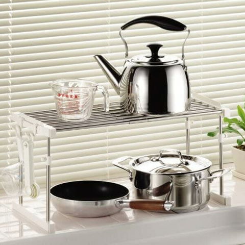 キッチンの上やシンク下の収納に便利なステンレスパイプ棚。
