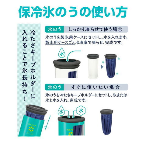 氷のうを冷たさキープホルダーにセットし、氷または氷と水を入れ、完成です。