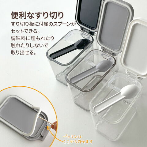 便利な摺り切り板すり切り板に付属のスプーンがセットできるので、調味料に埋もれたり触れたりすることがありません。