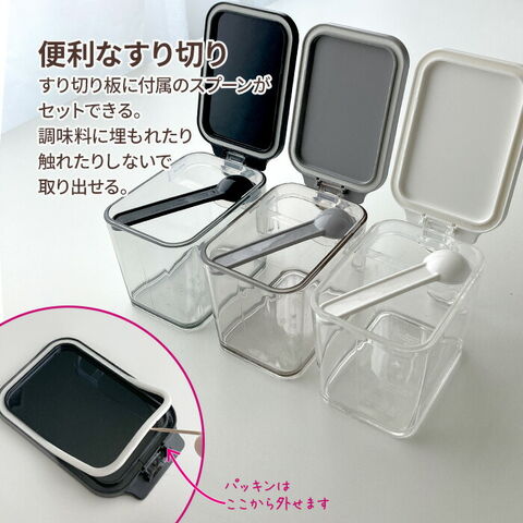 便利な摺り切り板すり切り板に付属のスプーンがセットできるので、調味料に埋もれたり触れたりすることがありません。