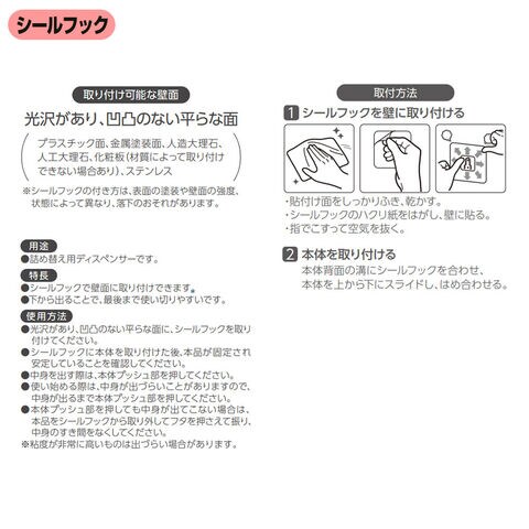 【シールフック】取り付け可能な壁面:光沢があり、凹凸のない平らな面(プラスチック面・金属塗装面、人工大理石、ステンレス、化粧板※材質によって取り付けできない場合あり) ※シールフックの付き方は、表面の塗装や壁面の強度、状態によって異なり、落下のおそれがあります。