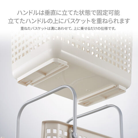 スタッキング機能つきハンドルは垂直に立てた状態で固定でき、 立てたハンドルの上にバスケットを重ねられます。※重ねたバスケットは溝にカチッとはまるものではなく、上に乗せるだけの仕様です。