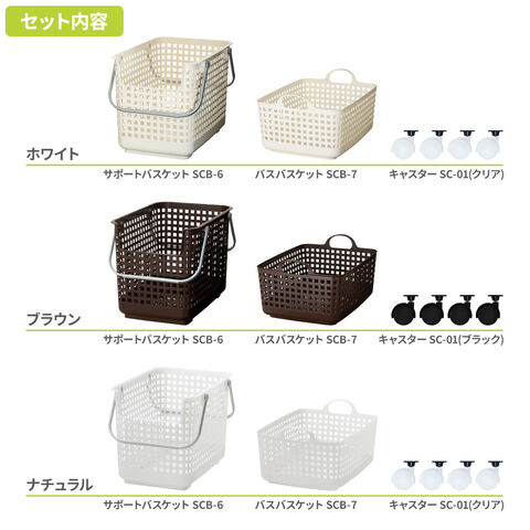 【カゴ/ホワイト】… キャスター/クリア、【カゴ/ブラウン】… キャスター/ブラック、【カゴ/ナチュラル】… キャスター/クリア の組み合わせになります。