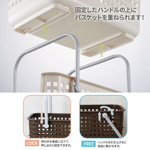 積み重ねて収納力アップ深型のバスケットは、ハンドルを垂直に立てた状態でロックでき、ハンドルの上に浅型のバスケットを重ねることができます。※重ねたバスケットは溝にカチッとはまるものではなく、上に乗せるだけの仕様です。