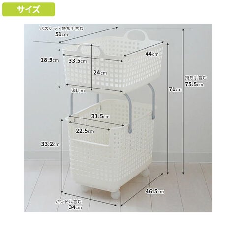 スペックサイズ(約):深型バスケット/幅34×奥行46.5×高さ33.2cm(ハンドルスタンド時の高さ/48.5cm) 浅型バスケット/幅33.5×奥行51×高さ24cm(取っ手を含まない高さ/19cm 深さ内寸/18cm) キャスター/幅3.8×奥行5.3×高さ5.9cm