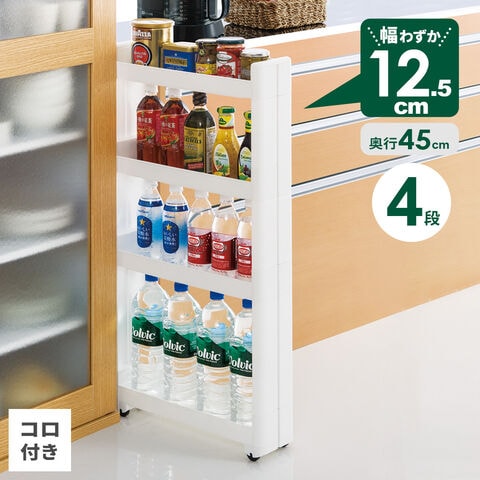 隙間ラック スマートワゴンFit 幅12.5×奥行45×高さ88.5cm 4段 ホワイト F-2545 | スリムワゴン すきま 収納ワゴン キャスター 移動 日本製 プラスチック 調味料ラック 省スペース キッチン収納 薄型 約13cm 洗面所 スリム すきまラック