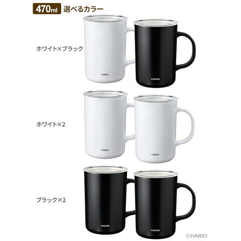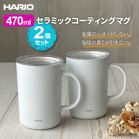 HARIO ハリオ セラミックコーティング 真空二重保温マグ 470ml (CMG-470) ×2個セット | マグカップ 保温 保冷 セラミックコート 真空断熱マグカップ 陶器調 口当たりがいい 金属臭がしない フタつき 蓋 温度長持ち コーヒー 紅茶 お茶 ティータイム 仕事 勉強 メモリつき