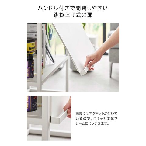 収納棚の前にある跳ね上げ式の扉はマグネットでピタッと本体に固定されます。