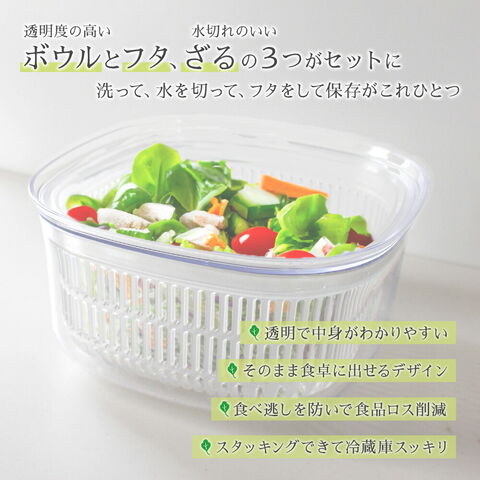 透明度の高いボウルとフタ、水切れの良いザルの3つがセットになった容器のレギュラーサイズ。
