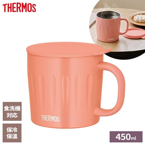 サーモス 真空断熱 マグカップ 450ml コーラルピンク JTA-450 | THERMOS 保温 マグ 大容量 保冷 食洗機対応 フタ付 蓋付き クラシック デザイン おしゃれ エンボス 縦ライン カフェオレカップ ホット コールド