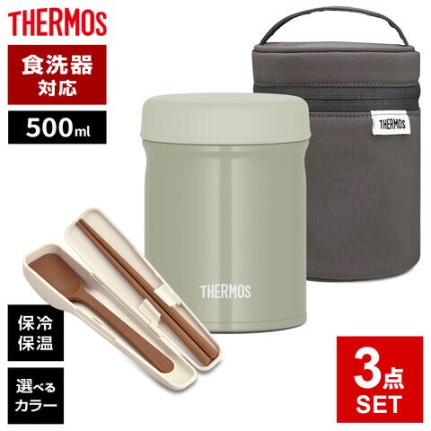 サーモス スープジャー 3点 セット 真空断熱 + ポーチ + スプーン・ハシ 500ml カーキ+Dグレー+Pホワイト JEB/JED/RES/CPE