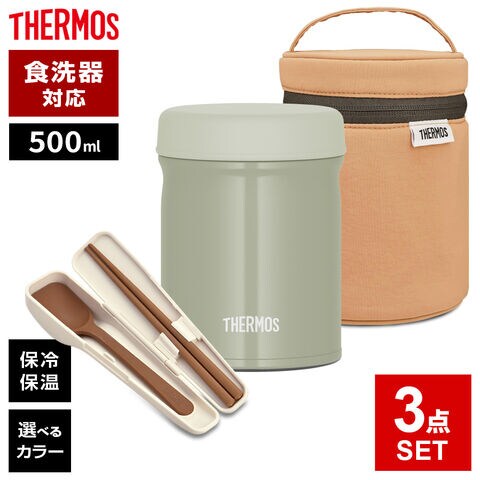 サーモス スープジャー 3点 セット 真空断熱 + ポーチ + スプーン・ハシ 500ml カーキ+シナモンベージュ+Pホワイト JEB/JED/RES/CPE